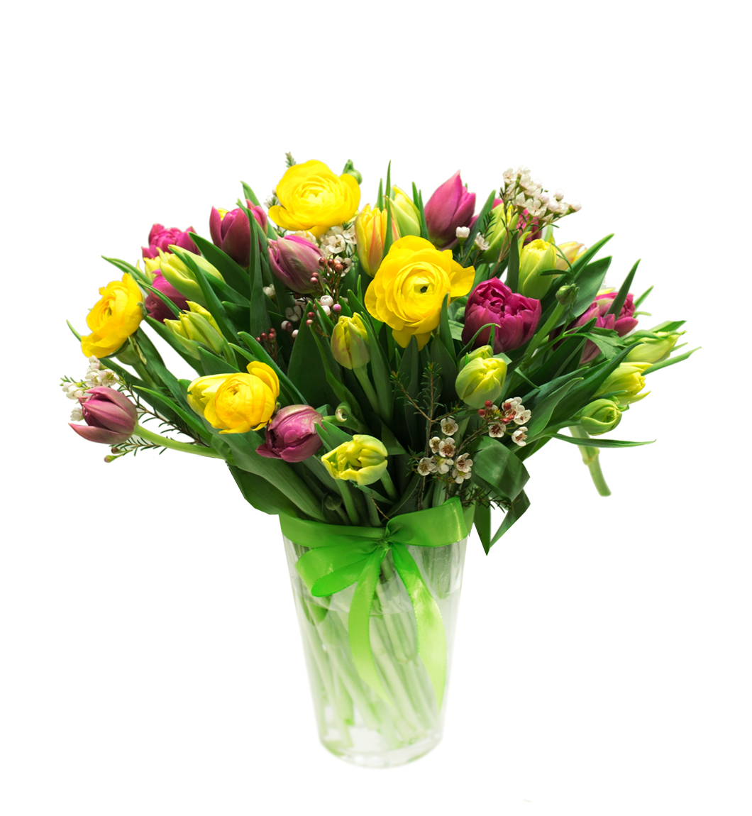 Kevadvärviline tulbikimp ja Hollandist tarnitud aasia tulikatest. Lillekimbus on kevadisi lõhnu ja värve.
