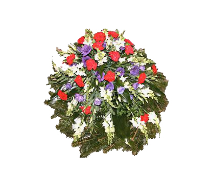 Pärg valgete, punaste ja siniste toonidega (lõvilõug, preeriakell, nelk).
